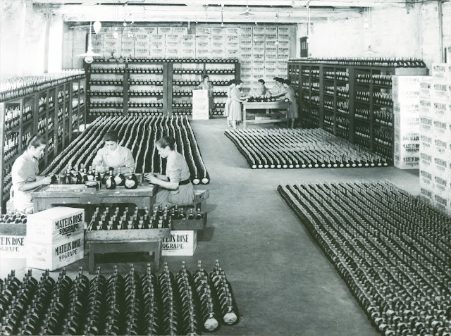 Fernando Guedes me disse que cerca de 75% do faturamento da Sogrape vem de fora de Portugal e informou que uma das marcas responsáveis por isso é outro clássico caso de marketing da empresa: o vinho Mateus Rosé. O Mateus Rosé (acima, em sua embalagem mais recente) tem números ainda mais impressionantes do que Sandeman: com 75 anos de existência, no ano passado teve cerca de 20 milhões de garrafas vendidas em mais de 100 países – quase 55 mil garrafas por dia! A marca representa 15% do total do faturamento da empresa e as vendas aumentam cerca de 8% em média, por ano. Na foto abaixo uma etapa de produção do Mateus em foto histórica.